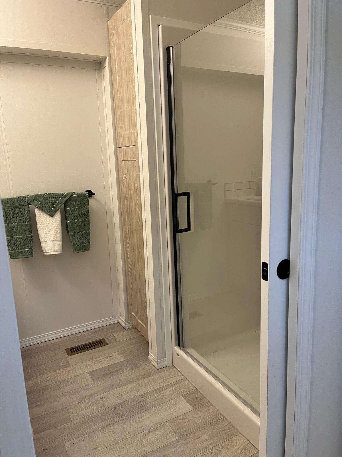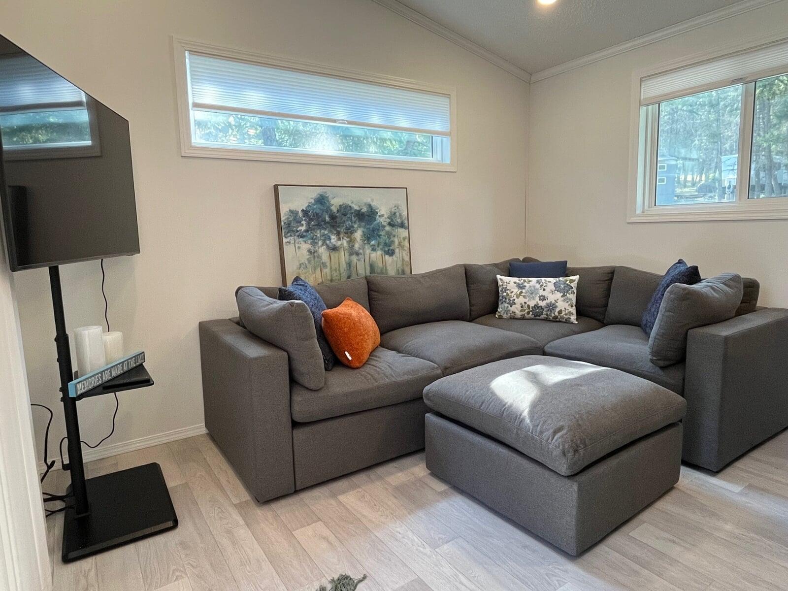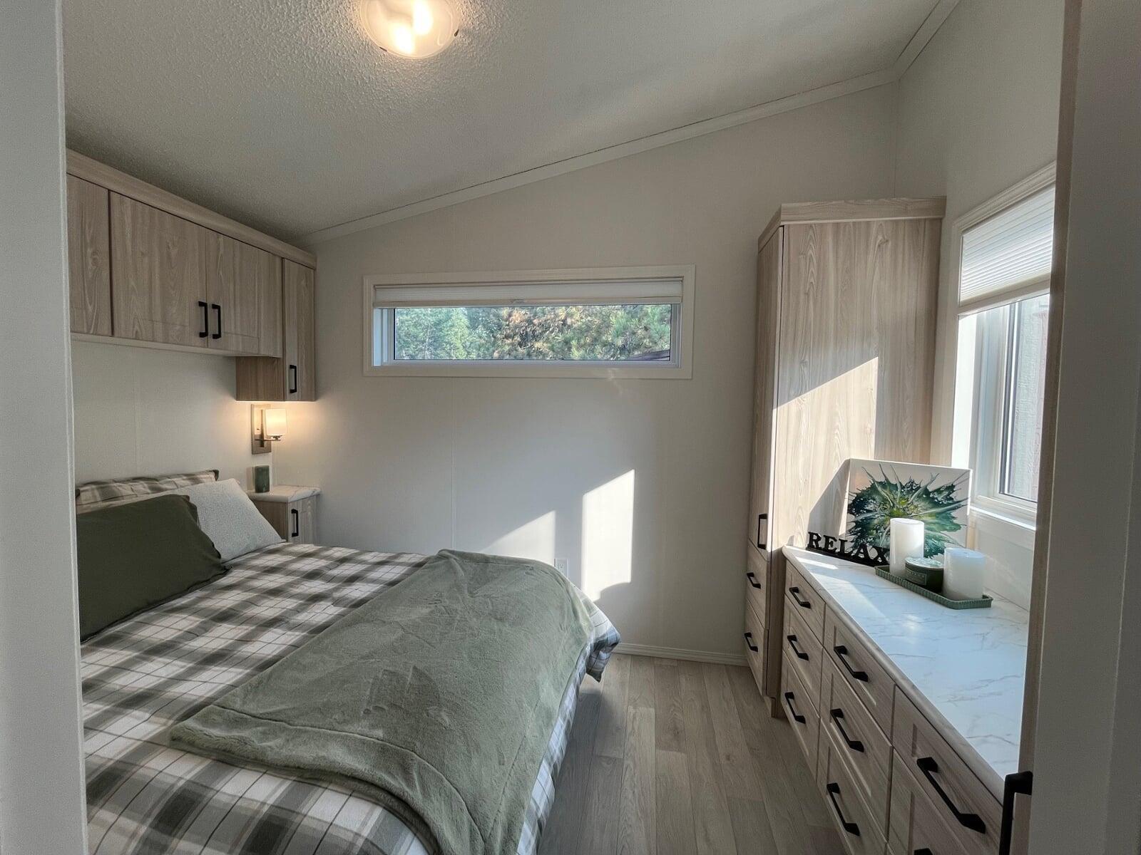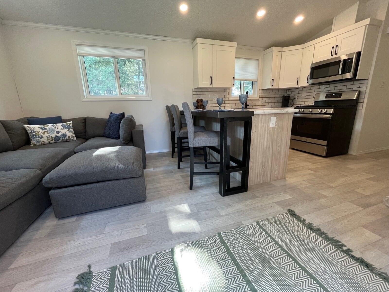 Inside, the bright and modern park model welcomes you with high ceilings, abundant natural light, and thoughtful storage throughout. The kitchen
