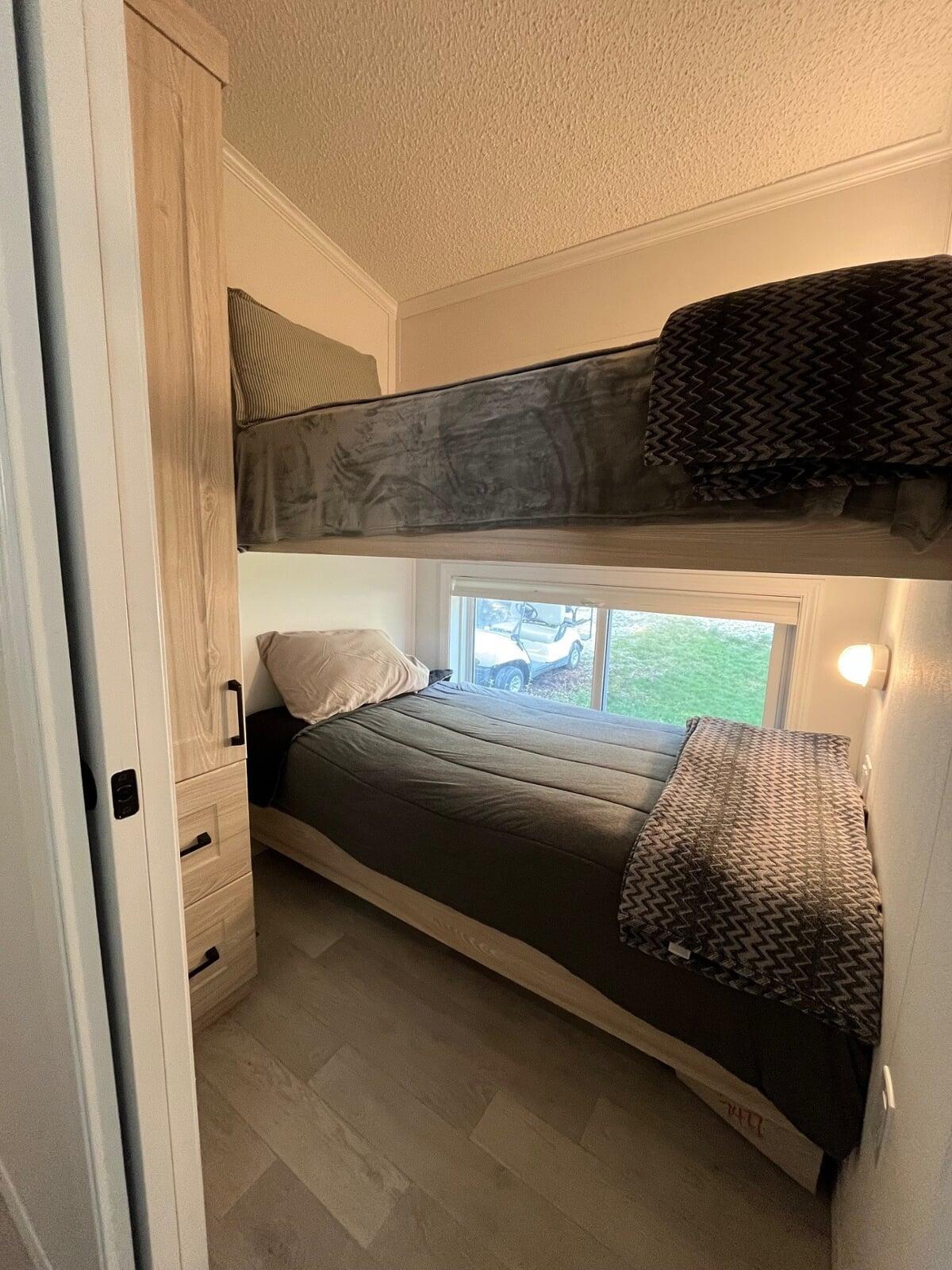 one bedroom with a queen bed and a second bedroom with bunk beds, making it ideal for families.