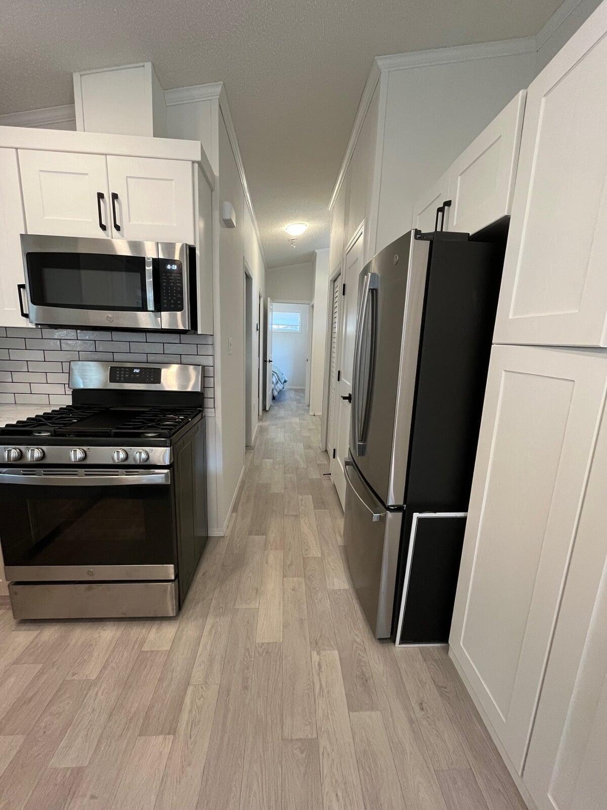 is well equipped with high-end appliances including a full-size refrigerator, propane range and oven, dishwasher, and spacious pantry. The layout includes