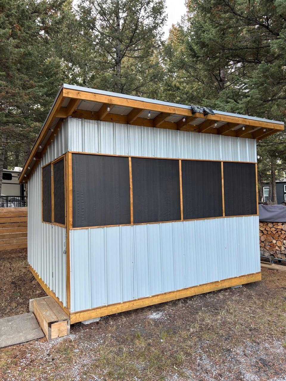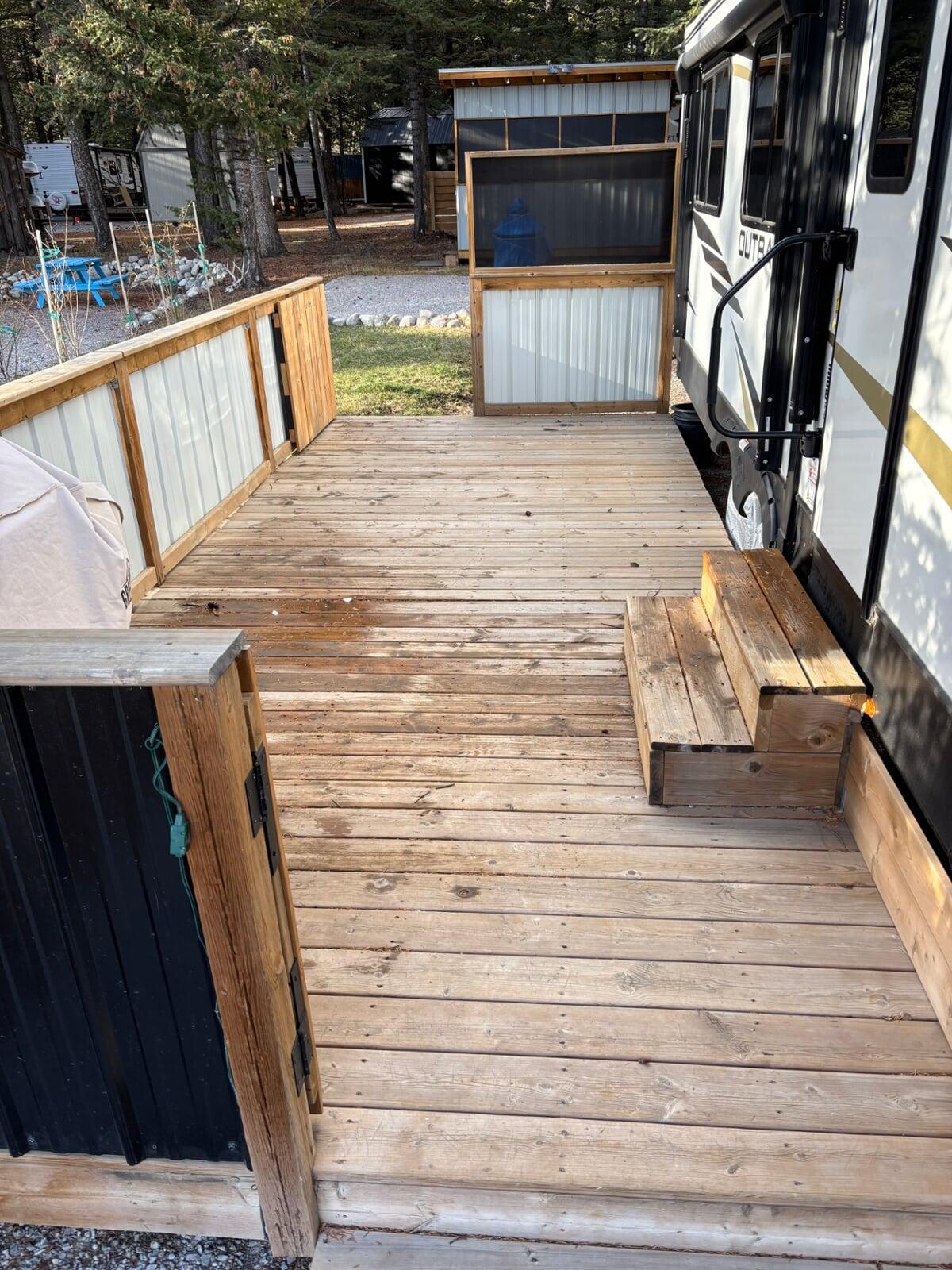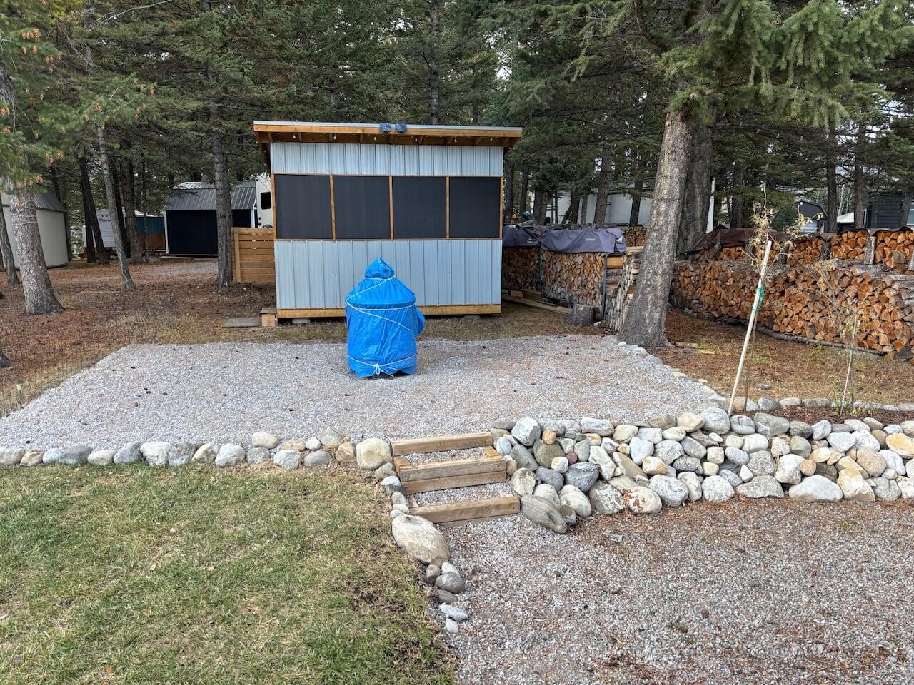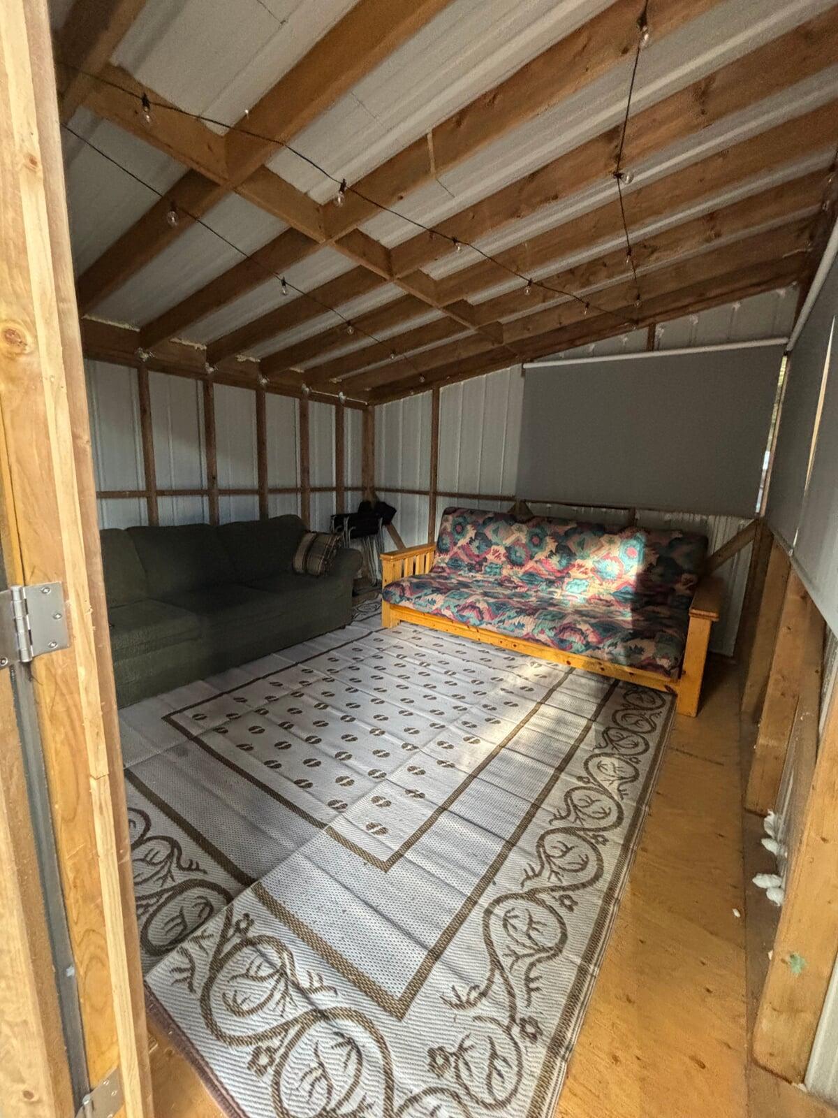 deck with privacy railing and propane BBQ, a 12’ x 12’ sunroom furnished with a futon & sofa, wood firepit with firewood all included in price.